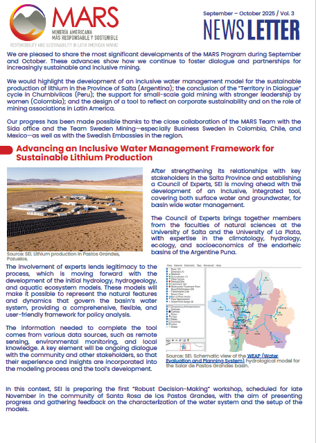 We are pleased to share the most significant developments of the MARS Program during September and October. These advances show how we continue to foster dialogue and partnerships for increasingly sustainable and inclusive mining. Progress has been made possible thanks to the close collaboration of the MARS Team with the Sida office and the Team Sweden Mining—especially Business Sweden in Colombia, Chile, and Mexico—as well as with the Swedish Embassies in the region.