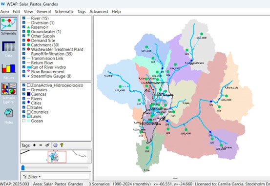 Schematic view of the WEAP (Water Evaluation and Planning System) hydrological model for the Salar de Pastos Grandes basin. Source: SEI.